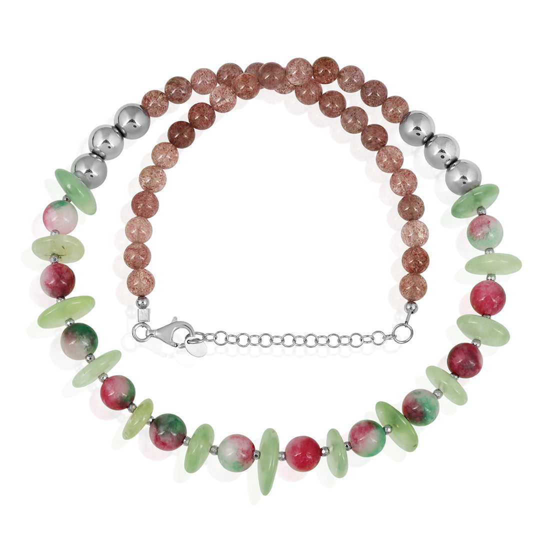 Prehnite, Hematite, and Strawberry Quartz Silver Necklace