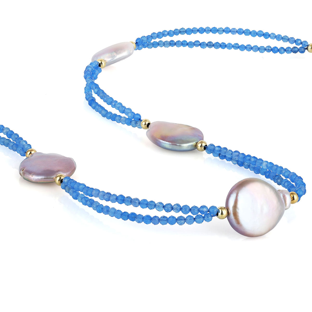 Natural Blue Onyx and Pearl Beads Handmade 925 Silver Necklace.