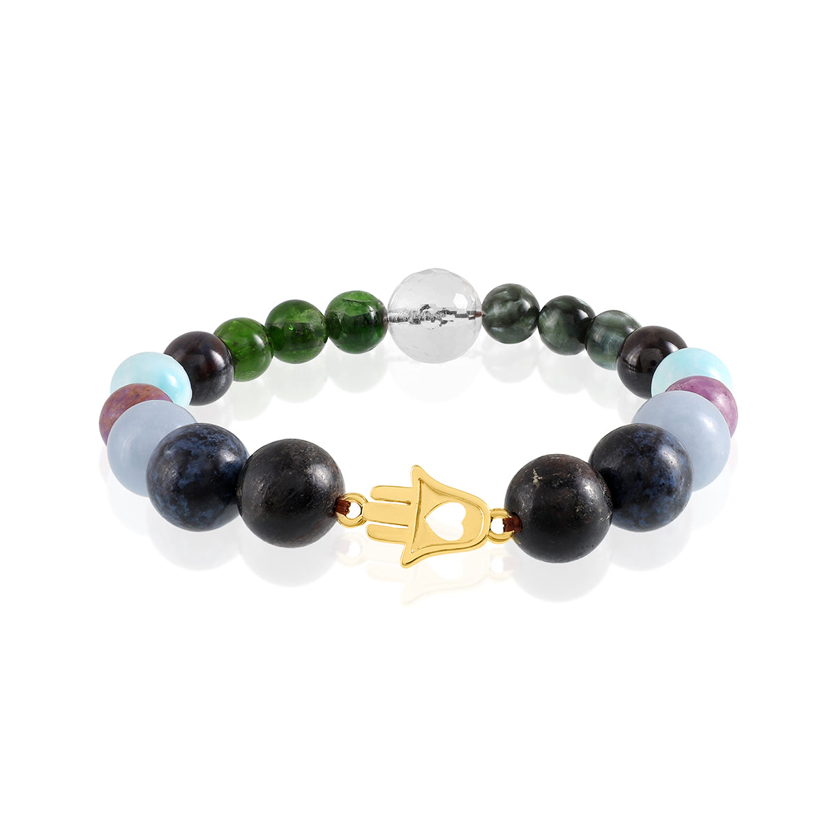 Experience the harmonious blend of powerful gemstones with our custom-designed bracelet featuring 10 mm smooth round beads of Dumortierite, Astrophyllite, and Angelite, 10 mm faceted round beads of Aura Quartz, 8 mm smooth round beads of Phosphosiderite, Hemimorphite, and Sugilite, and 6 mm smooth round beads of Chrome Diopside and Seraphinite. The Hamsa Hand Charm adds a touch of protection and style to this exquisite piece.