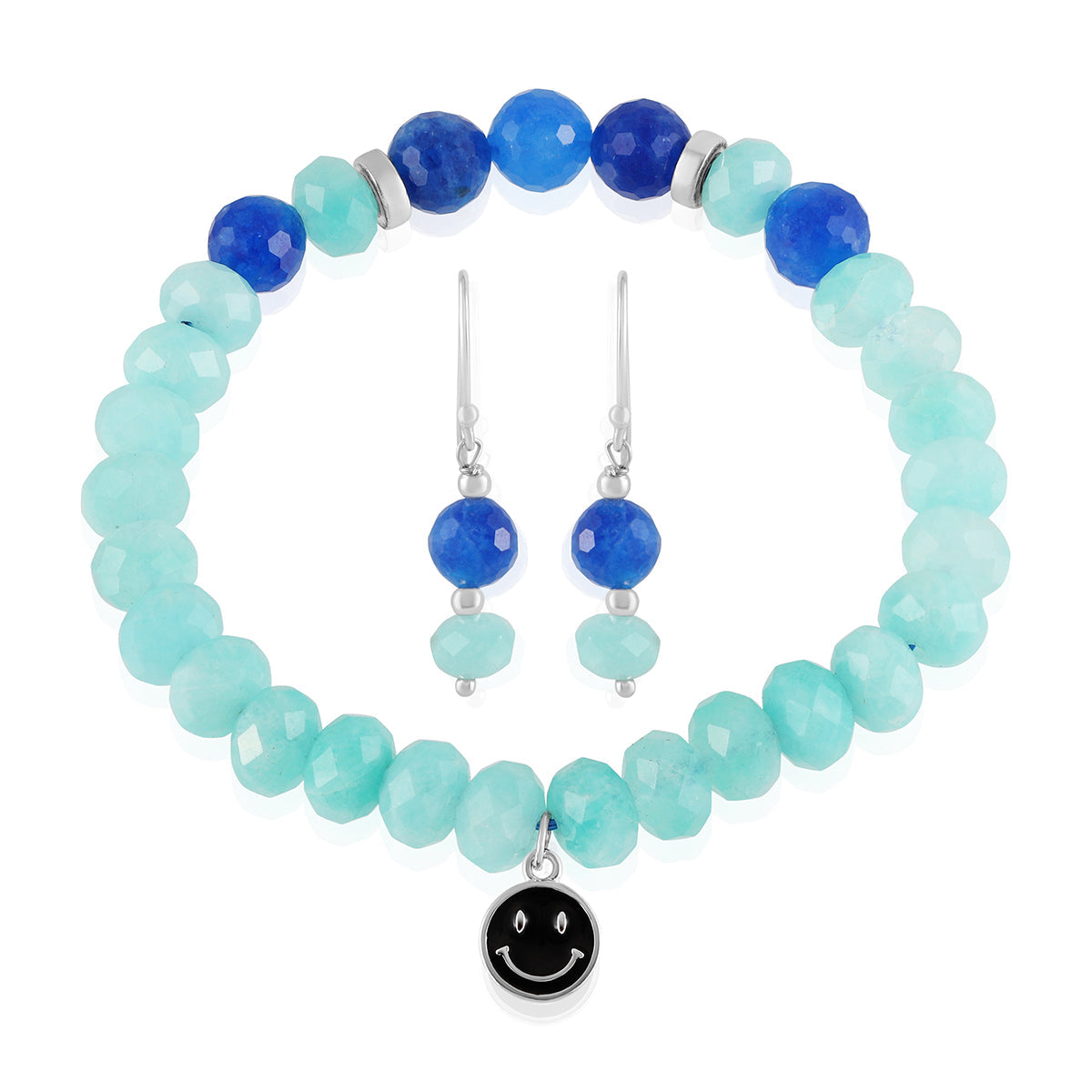 Treat your sister to the ultimate jewelry experience with this Green and Blue Quartz Jewelry Set, featuring a stunning stretch bracelet and matching earrings. The bracelet showcases 8 mm faceted rondelle Green Quartz beads, 8 mm faceted round Blue Quartz beads, and smooth wheel Hematite beads (6 mm), adorned with a delightful silver smiley charm. The matching earrings feature 8 mm faceted rondelle Green Quartz beads and 8 mm faceted round Blue Quartz beads, set in elegant silver. This coordinated set offers a perfect blend of style and sophistication, making it an ideal gift for your sister on Rakhi or any special occasion.
