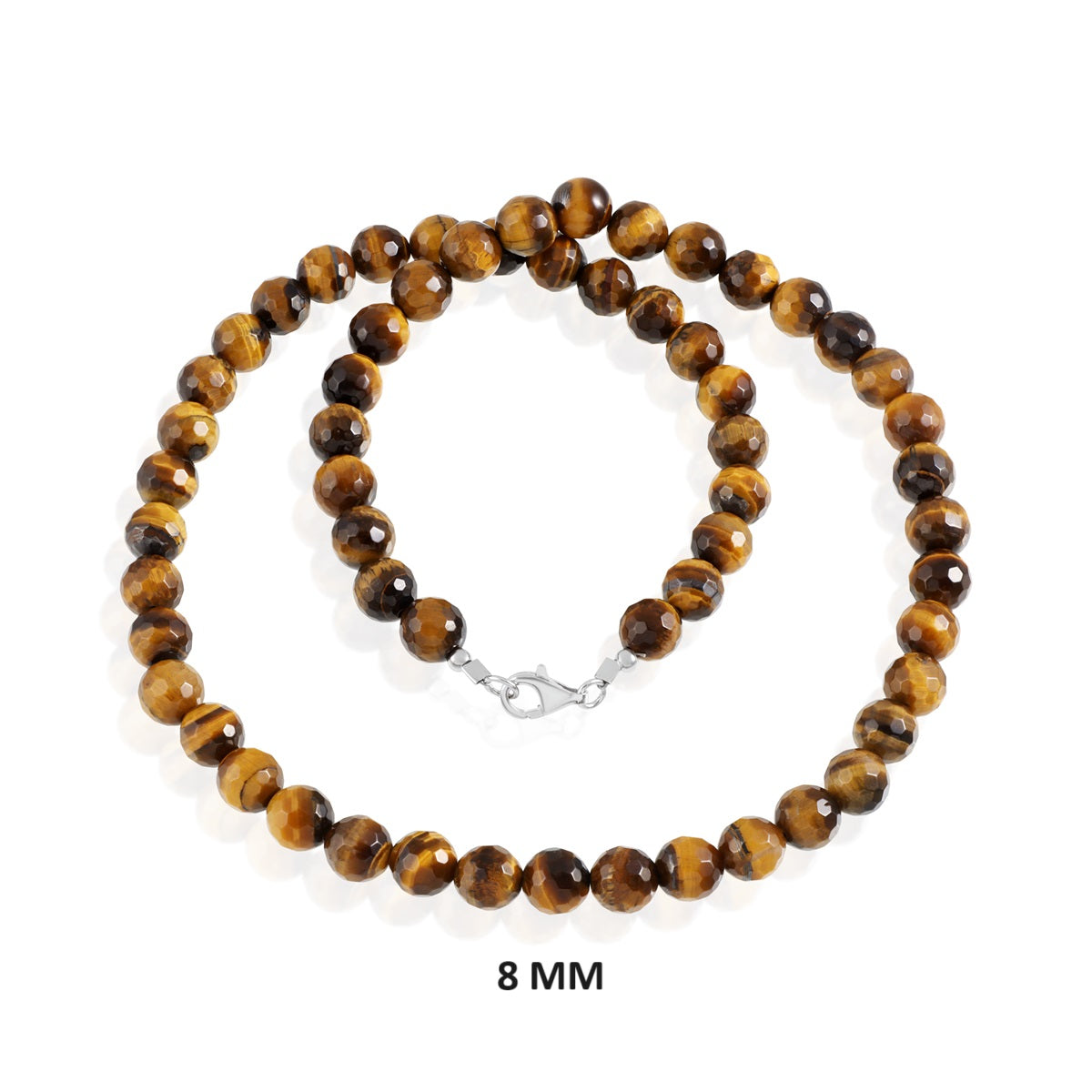 Introducing our Tiger's Eye Gemstone Beads Silver Necklace, meticulously crafted for the modern gentleman seeking both style and holistic benefits. Each faceted round bead, measuring 8mm, radiates sophistication and charm. Complemented by a White Rhodium plated Silver Lock, this necklace offers both security and refinement for daily wear.